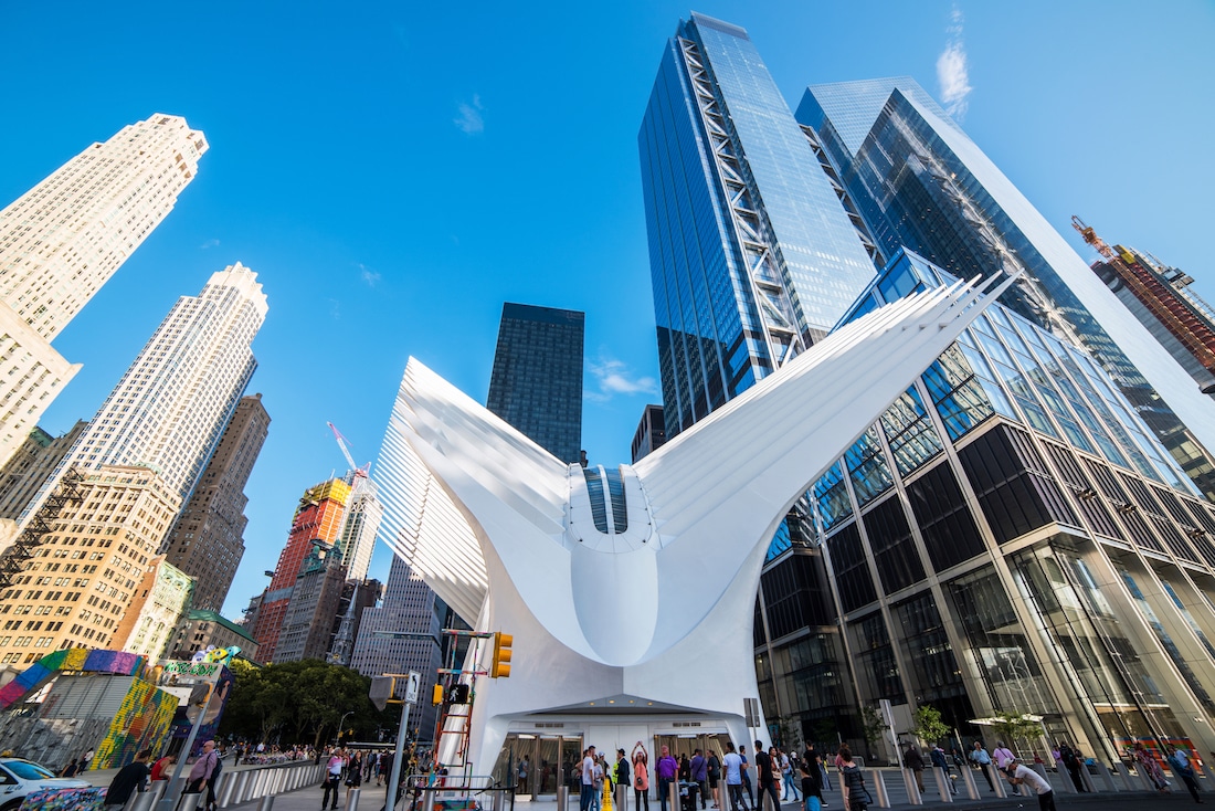 The Oculus is a station in New York City with a very futuristic design. It is located next to the Tower 1 of the World Trade Center.